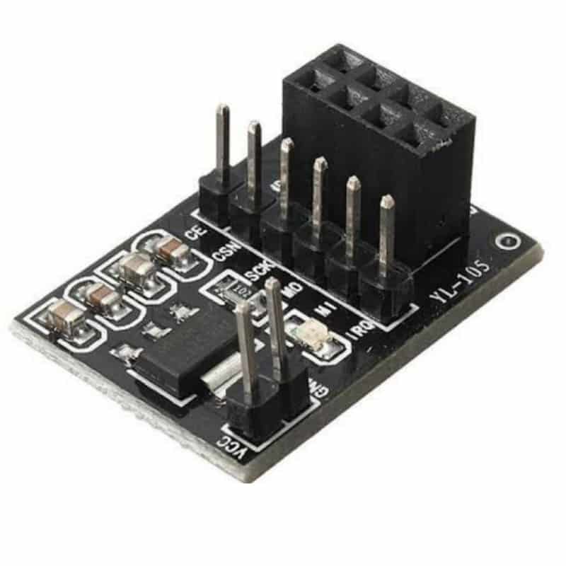 • 6 pin headers correspond to the SPI interface; from left to right: CE, CSN, SCK, MOSI, MISO, IRQ.